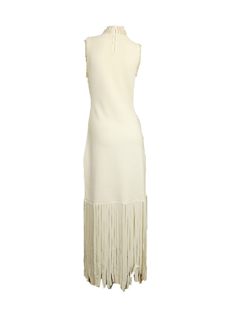 - It has a straight, slightly A-line silhouette and features a long fringe hem that falls well past the knee. Overall aesthetic is elegant, minimalist, with a playful fringe detail at the hem.