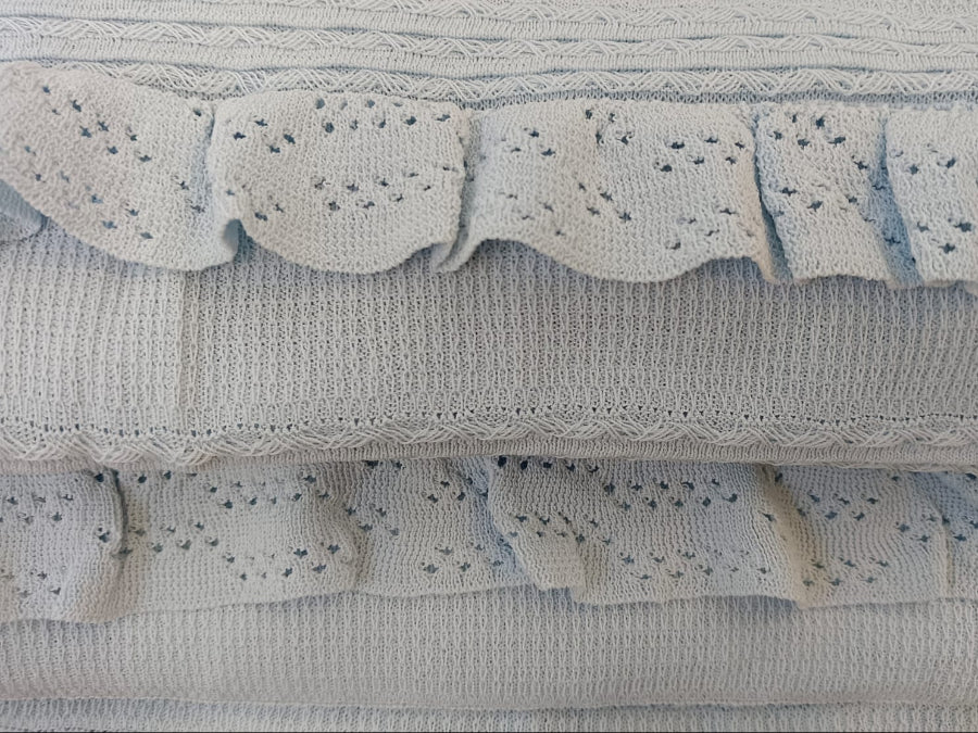 A sleeveless pastel blue dress features a fitted bodice and multiple tiers of ruffles and textured horizontal bands. The ruffle accents at the seams, creating a tiered, feminine look.