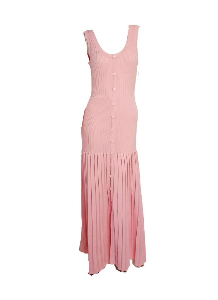 A pastel pink midi dress with a fitted bodice and a flared pleated skirt. The top portion has a scoop neckline and button-down detail running along the front, giving it a structured yet feminine look. The ribbed on the bodice, enhancing its form-fitting silhouette, and transitions into soft, flowing pleats below the waist.