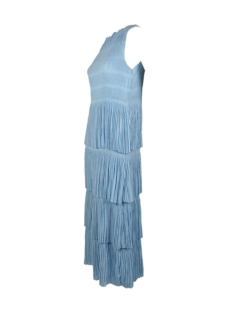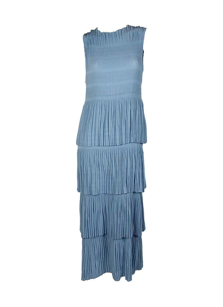 Designed with a flattering round neckline and sleeveless cut, the dress features cascading pleated tiers that create soft, flowing movement with every step. Perfect for both daytime elegance and evening charm, its lightweight fabric ensures comfort without compromising style.