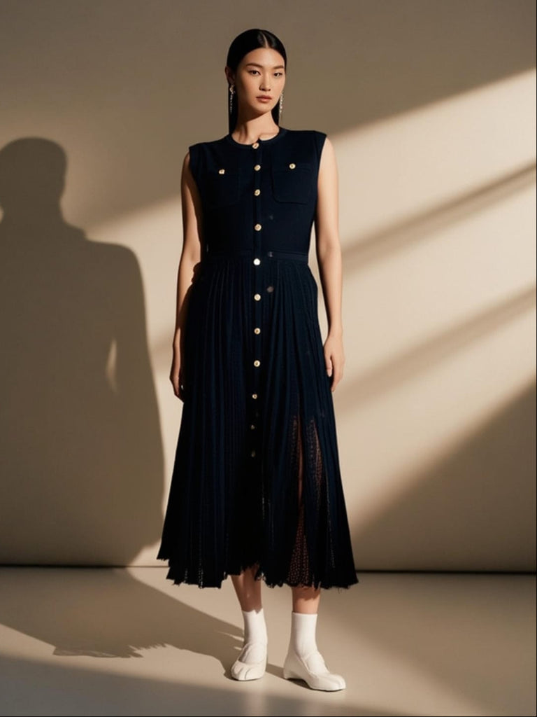 The dress features a sleeveless fitted bodice with two front chest pockets, each secured with a gold button. It has a round neckline and a vertical button-down design running from the neckline to the hem, the gold buttons adding a chic, polished touch. The skirt portion has a delicate, textured knit pattern with vertical lines, giving it a slightly flared silhouette and a soft drape. The hemline is subtly scalloped, enhancing the feminine and elegant look.