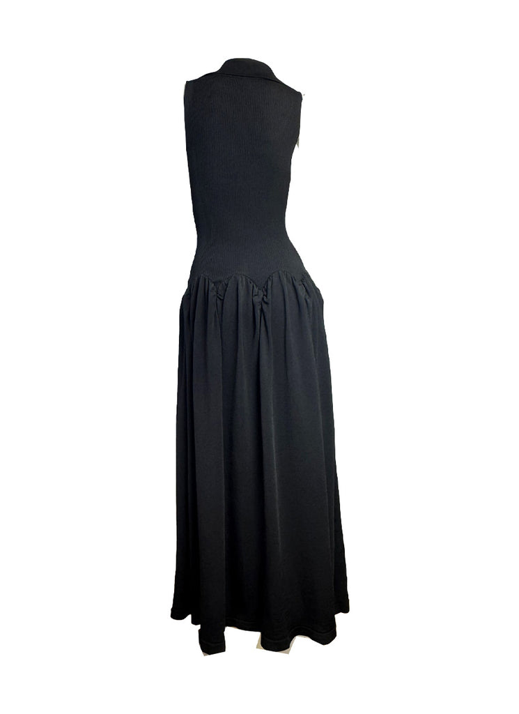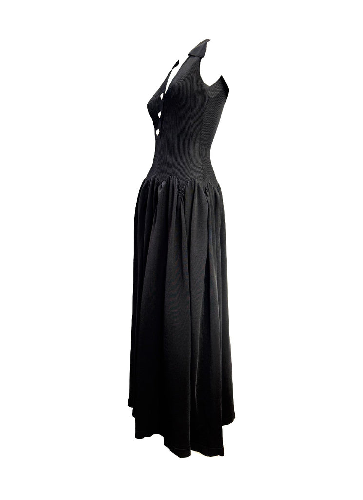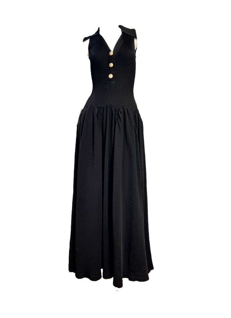 Refined and timeless, this sleeveless black maxi dress embodies modern sophistication. Crafted from a soft yet structured fabric, it features a fitted rib-knit bodice with a deep V-neckline, accented by a pointed collar and three gold-tone statement buttons. The waistline gently flares into a flowing, A-line skirt that drapes gracefully to ankle length, offering movement and ease.