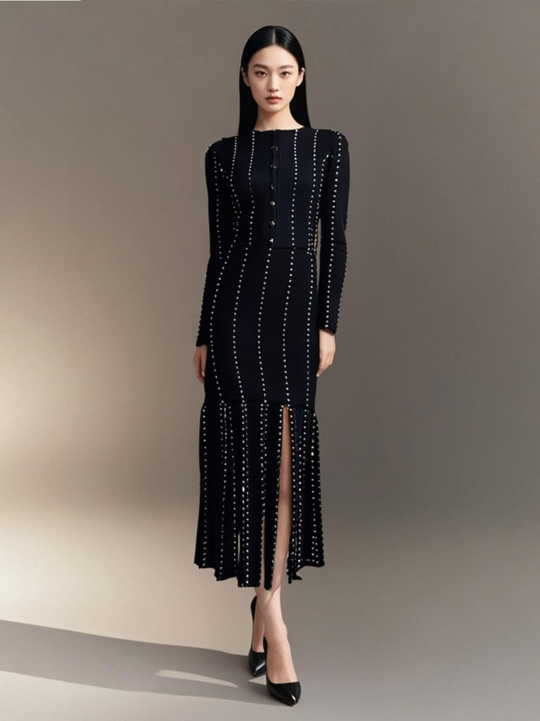 - Long-sleeve crew neck cardigan with button-down front with vertical small pearls arranged in evenly spaced rows