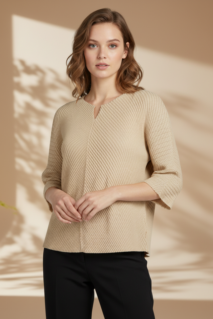 This top features a textured, diagonal pattern with a relaxed fit and three-quarter sleeves. It has a simple V-neckline that adds a subtle yet elegant detail to the design.