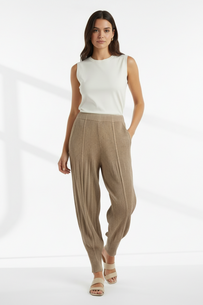 These pants feature a soft, pleated design in a neutral beige color, giving them a relaxed and sophisticated look. The pleats add texture, while the loose fit offers comfort and a flowy vibe. With an elastic waistband, they’re easy to wear and move in.