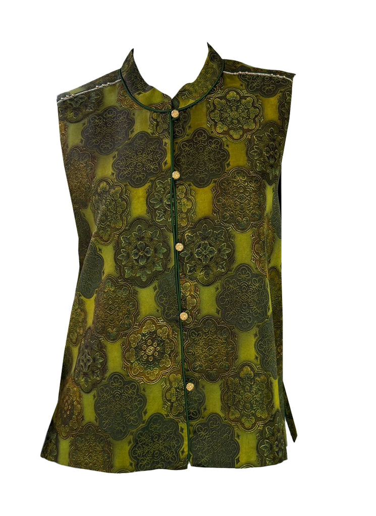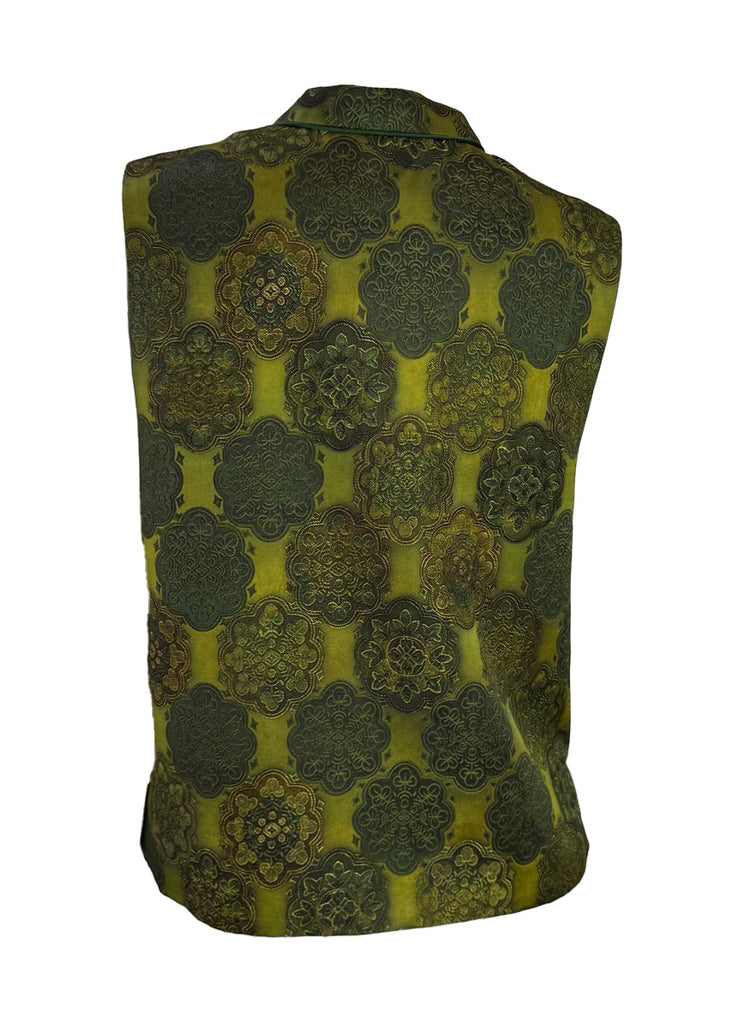 - Print: Lime-green fabric with an intricate dark floral, geometric lace-like pattern, repeated across the front.