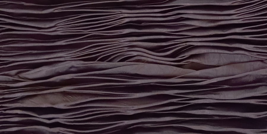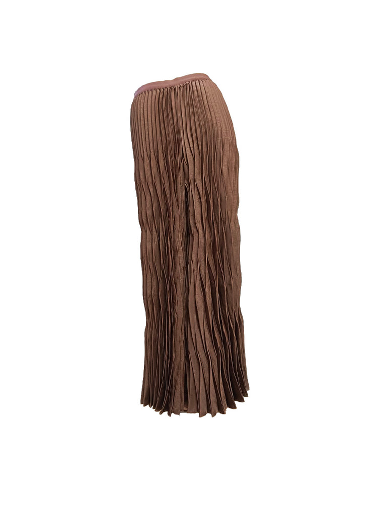 A long, full-length pants with a distinctive vertical pleat pattern. Flowing, satin texture created by evenly spaced, narrow pleats that run from the elastic waist to the hem, giving a structured yet fluid appearance. The lightweight fabric contribute to a soft, elegant drape, creating a graceful sihoutte.Â