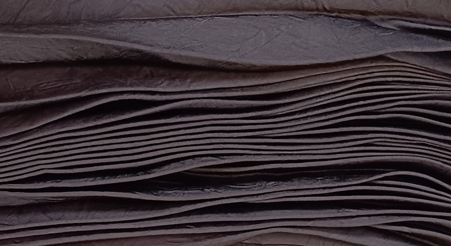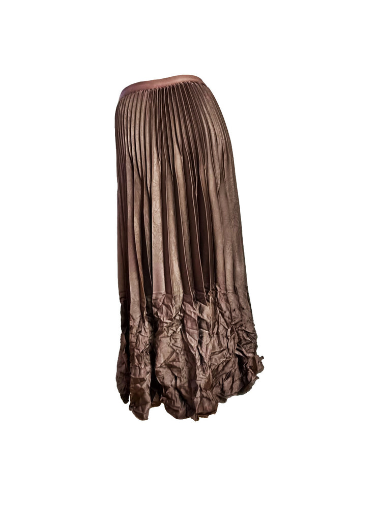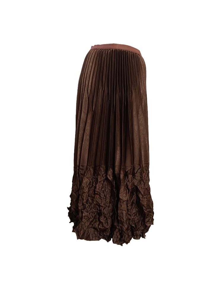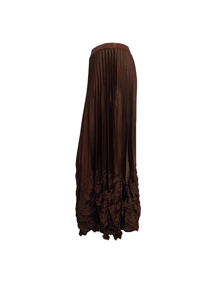 The skirt is a midi-length, A-line style with a striking pleated design. It features a dark-to-light brown gradient and structured vertical pleats that create a flowing, dimensional look. The hem is gathered and ruffled, giving a voluminous, bubble-like lower edge. Lightweight contributing to a soft, breezy drape. Overall, it has a dramatic, sculptural silhouette with a elastic waist