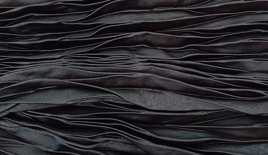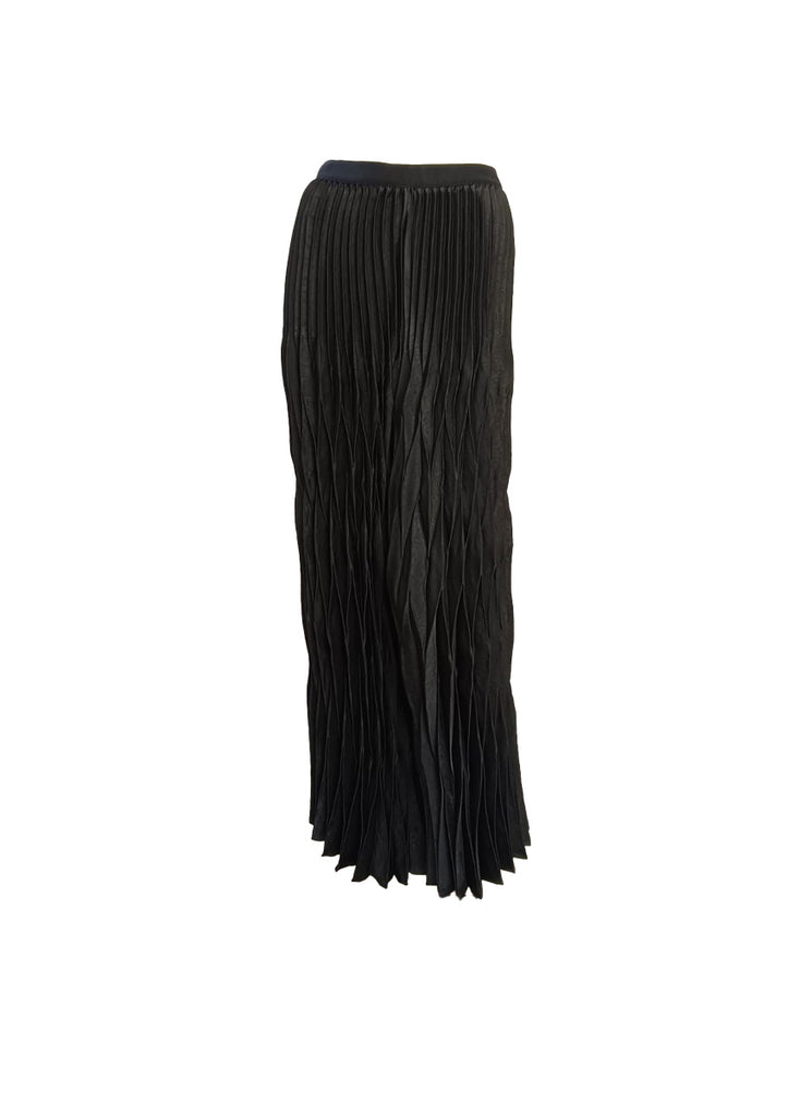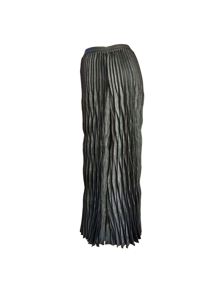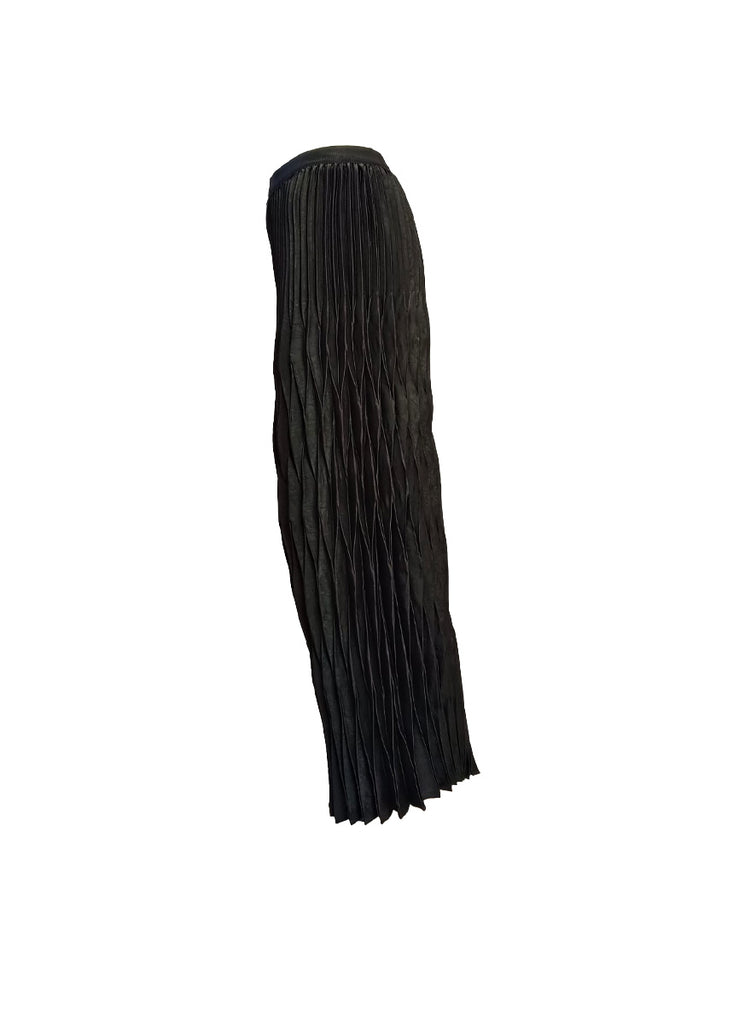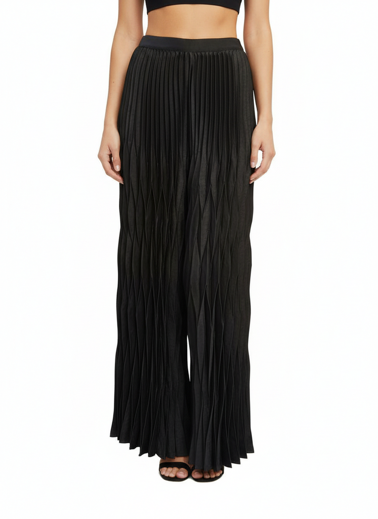 A long, full-length pants with a distinctive vertical pleat pattern. Flowing, satin texture created by evenly spaced, narrow pleats that run from the elastic waist to the hem, giving a structured yet fluid appearance. The lightweight fabric contribute to a soft, elegant drape, creating a graceful sihoutte.Â