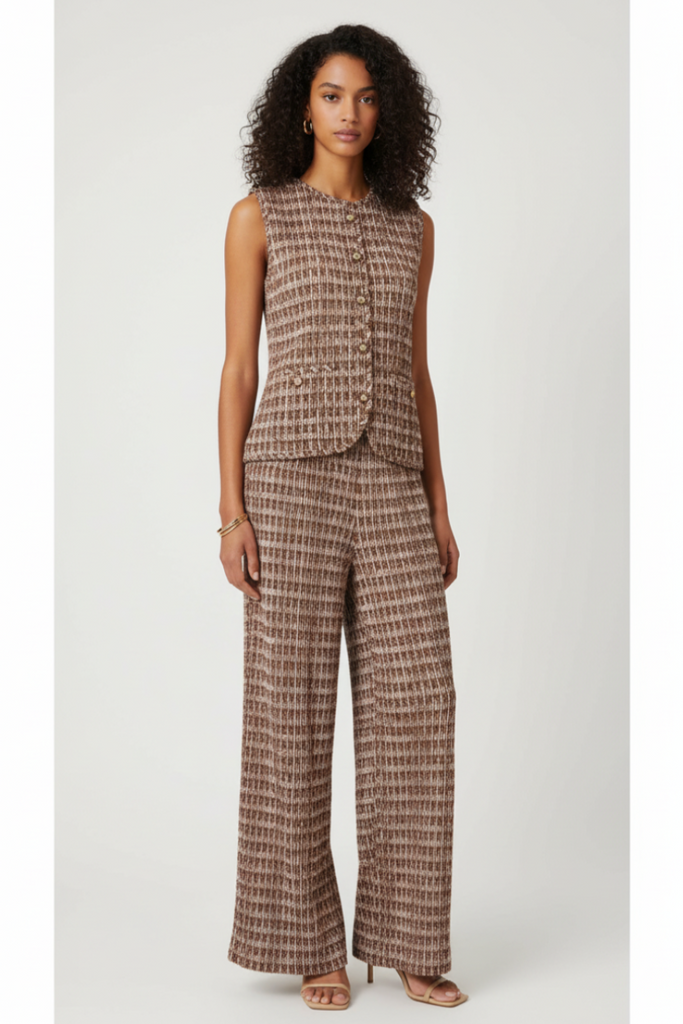Overall vibe: Sophisticated tweed set with a relaxed fit. Modern, yet timeless look suitable for work or smart casual event.