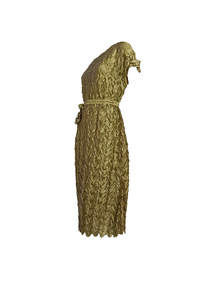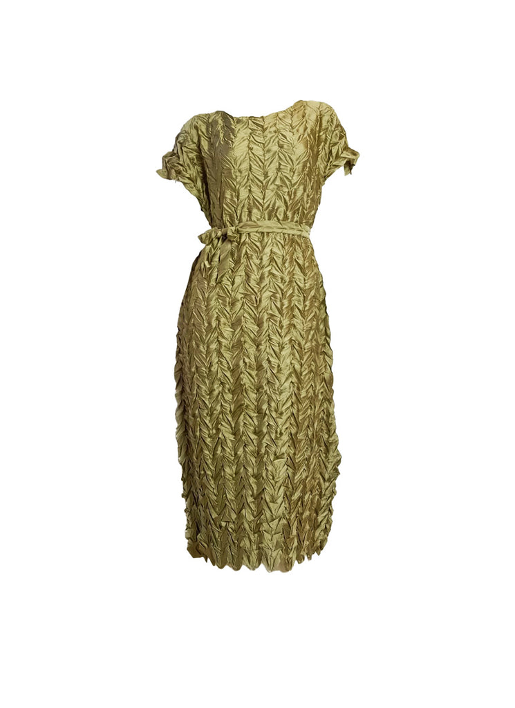 The dress is a knee-to midi-length style in a metallic olive-green shade. It features short puff sleeves and a relaxed bodice with a defined waist. The skirt has a full, A-line silhouette with a textured pattern that creates a rich, dimensional surface. The overall look is dressy and feminine, with a vintage-inspired charm.