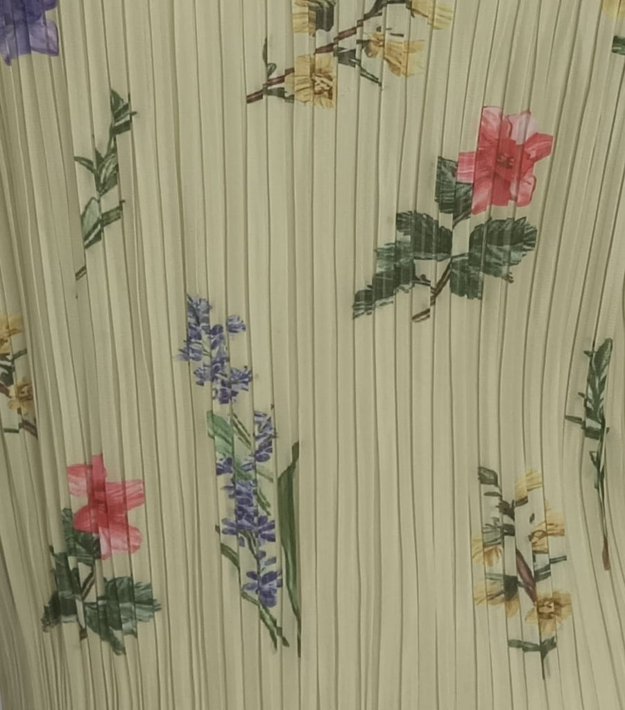 Pattern and texture: Yellow base with an all-over floral, ribbed pleats texture.
