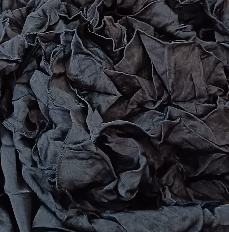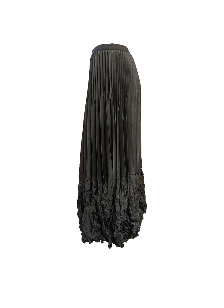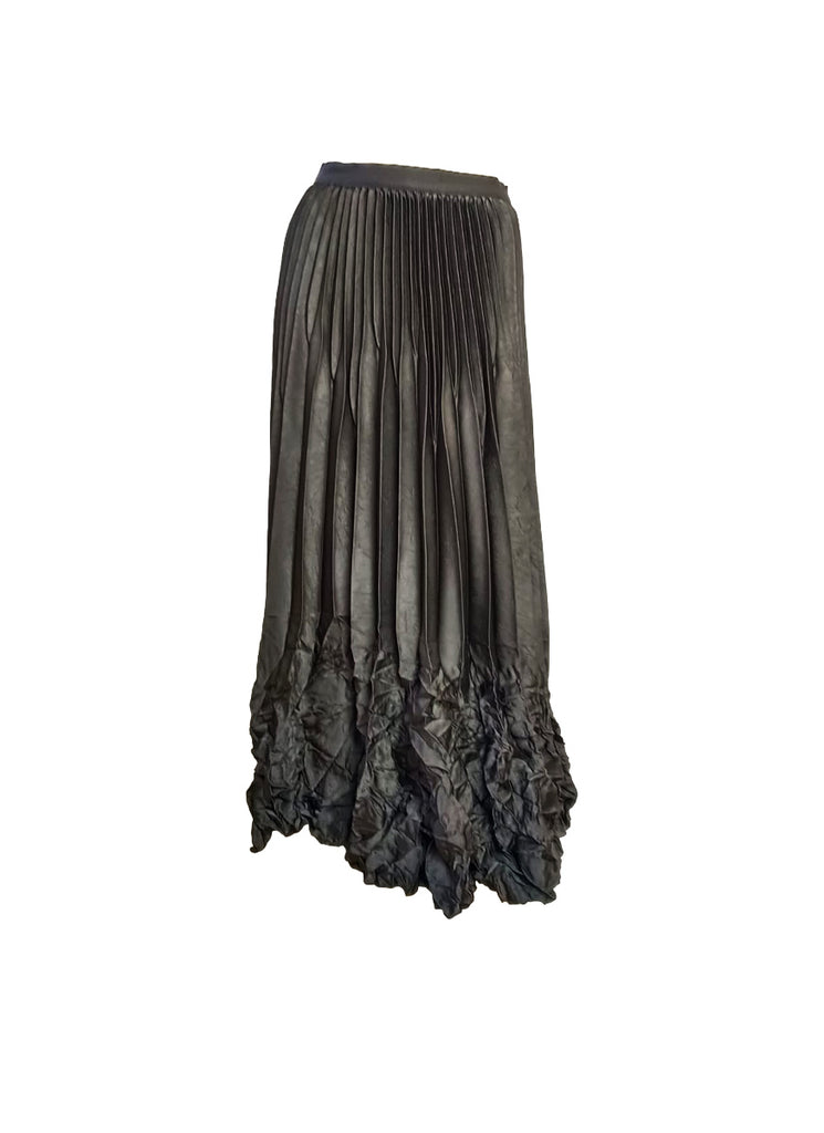 The skirt is a midi-length, A-line style with a striking pleated design. It features a dark-to-light black gradient and structured vertical pleats that create a flowing, dimensional look. The hem is gathered and ruffled, giving a voluminous, bubble-like lower edge. Lightweight contributing to a soft, breezy drape. Overall, it has a dramatic, sculptural silhouette with a elastic waist