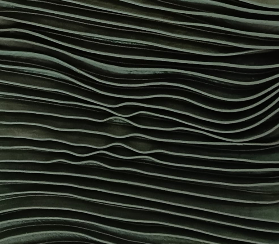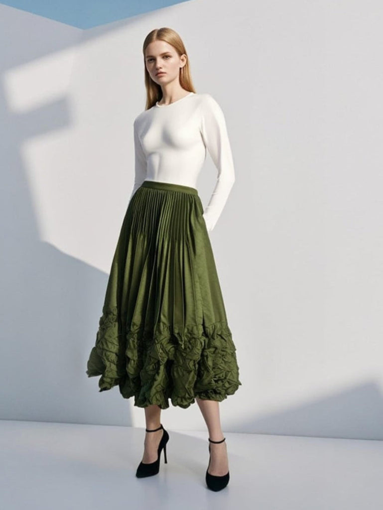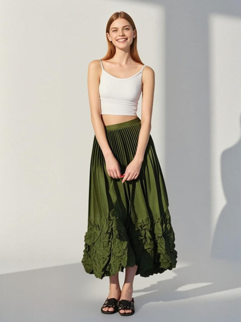 The skirt is a midi-length, A-line style with a striking pleated design. It features a dark-to-light green gradient and structured vertical pleats that create a flowing, dimensional look. The hem is gathered and ruffled, giving a voluminous, bubble-like lower edge. Lightweight contributing to a soft, breezy drape. Overall, it has a dramatic, sculptural silhouette with a elastic waist