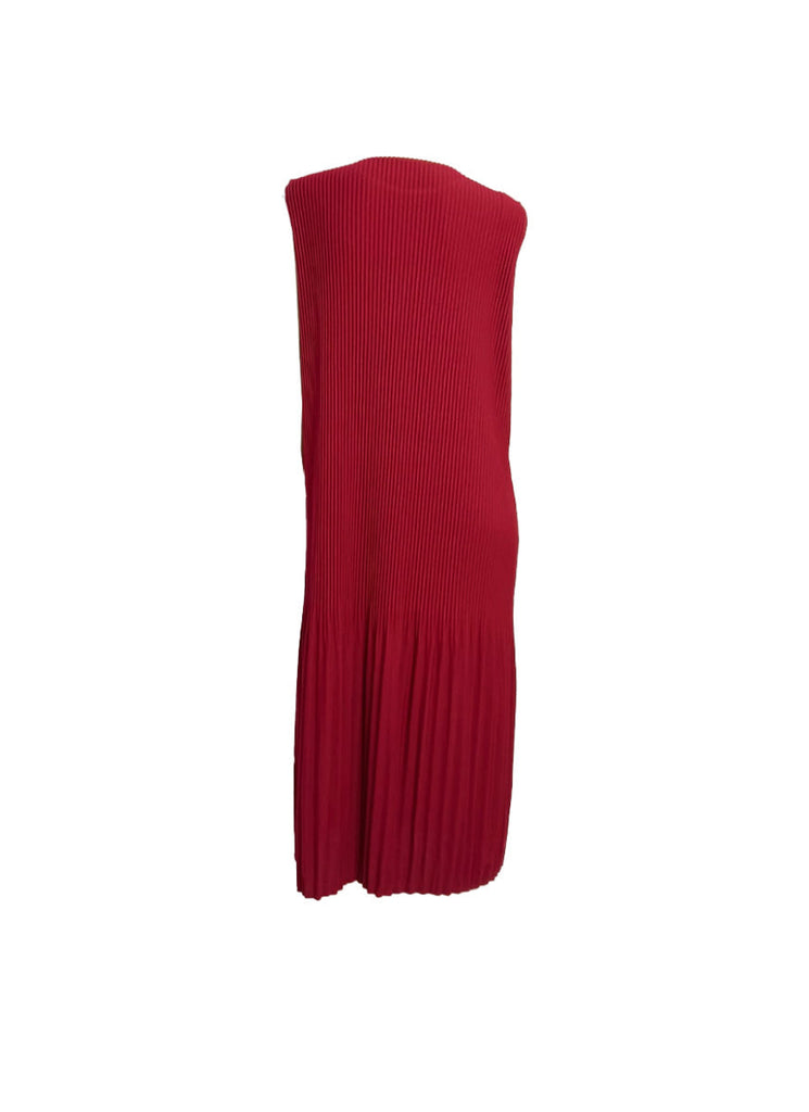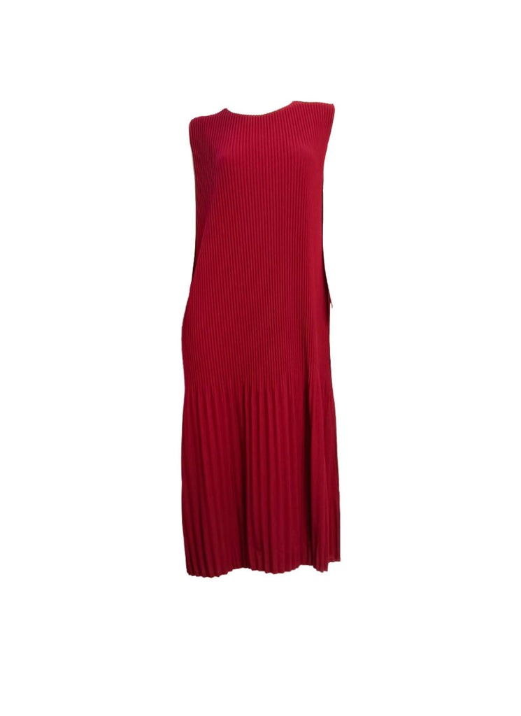 The dress is a sleeveless, knee-length shift style in red. It features a simple, clean silhouette with a rounf neckline and a structured, minimalizied shape. The pleated lightweight fabric has a soft drape, giving a modern, fresh look suitable for warm weather or layering.
