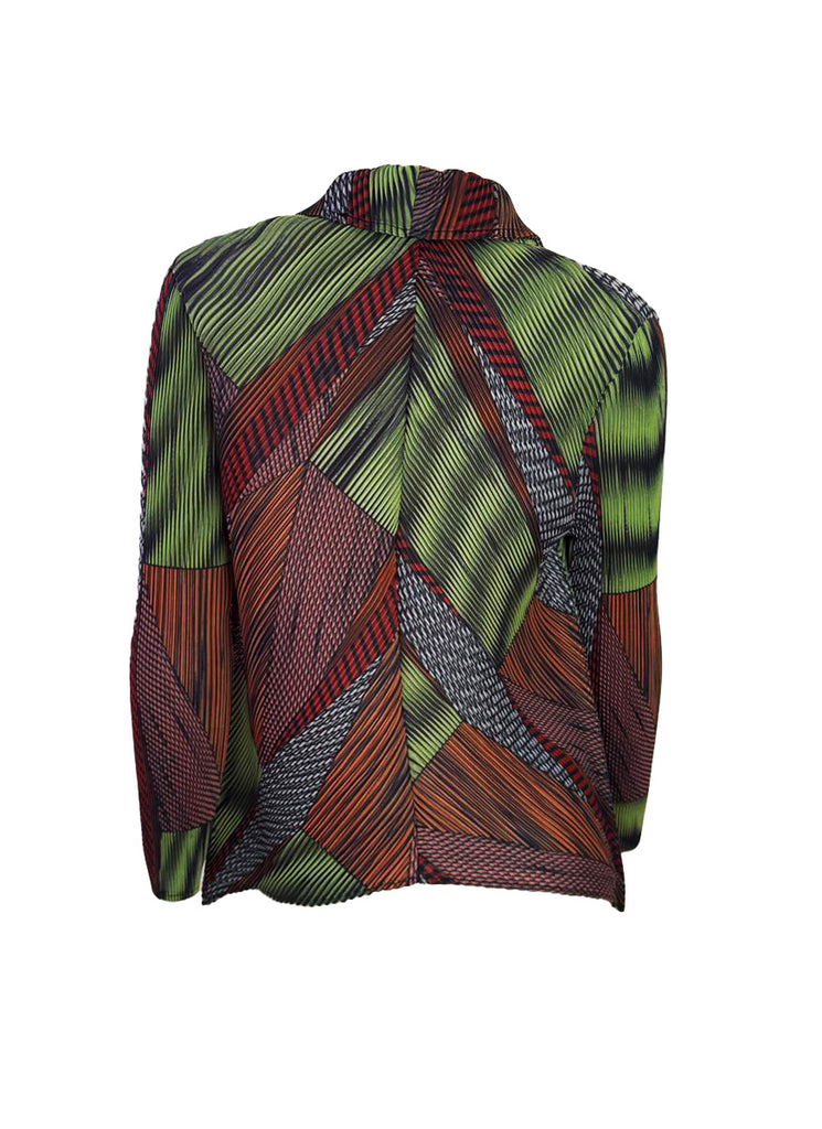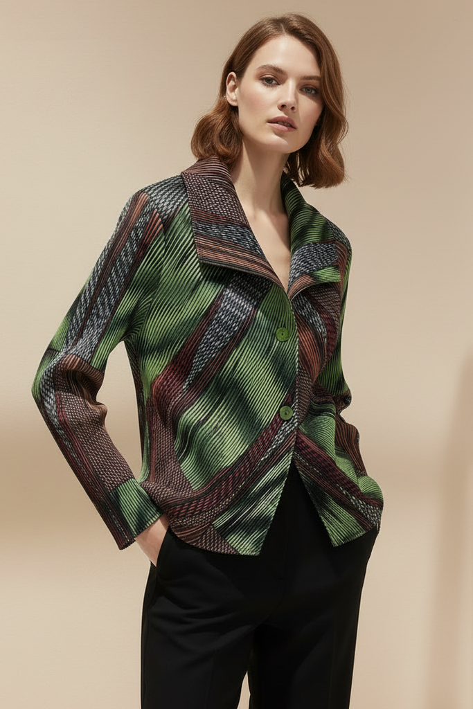 - Style: Modern, draped jacket with a sculptural, asymmetric front.