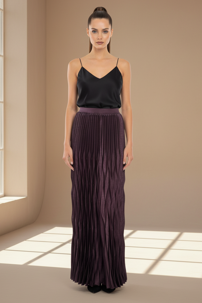 A long, full-length pants with a distinctive vertical pleat pattern. Flowing, satin texture created by evenly spaced, narrow pleats that run from the elastic waist to the hem, giving a structured yet fluid appearance. The lightweight fabric contribute to a soft, elegant drape, creating a graceful sihoutte.Â