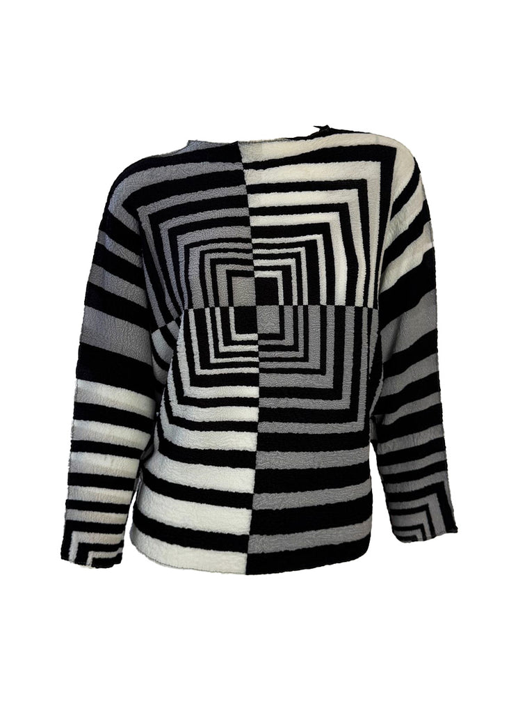Color and pattern: a bold geometric color-block knit in shades of grey, white, and black with concentric square motifs.