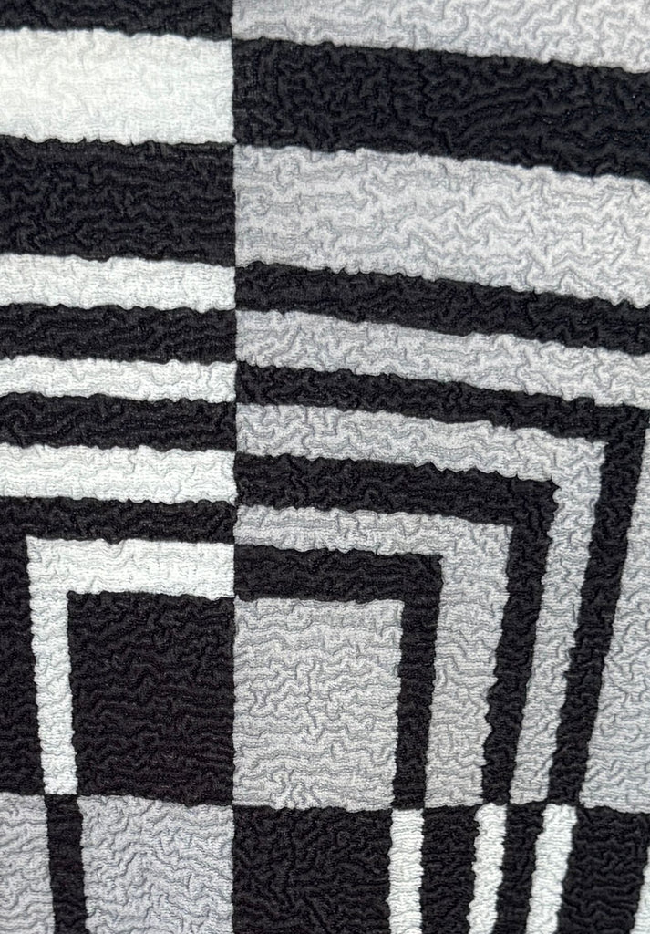 Pattern detail: high-contrast, optical pattern created by rectangular spirals that radiate from the center, giving a graphic, retro look.