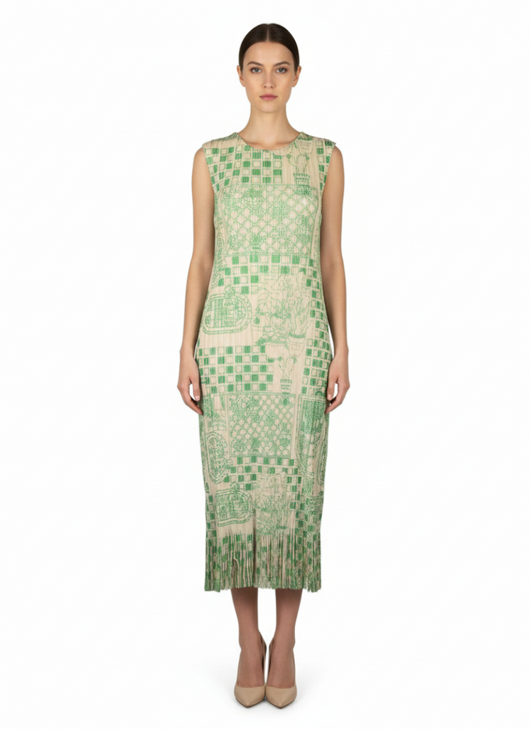 Feel effortlessly stylish in this pleated dress with a unique geometric pattern. Perfect for any event, it pairs beautifully with heels for a sophisticated, polished look. The soft fabric and flattering fit make it a go-to for both day and evening wear.