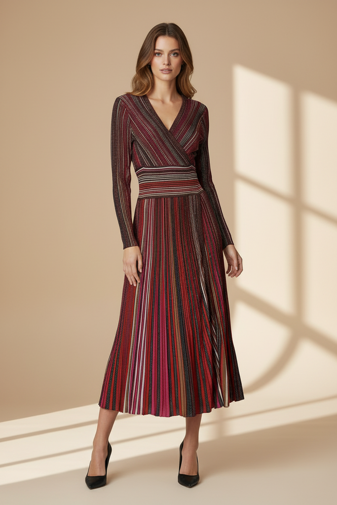A pleated A-line skirt that flows down to mid-calf length, incorporating vivid vertical stripes in blue, purple, magenta, and red shades.