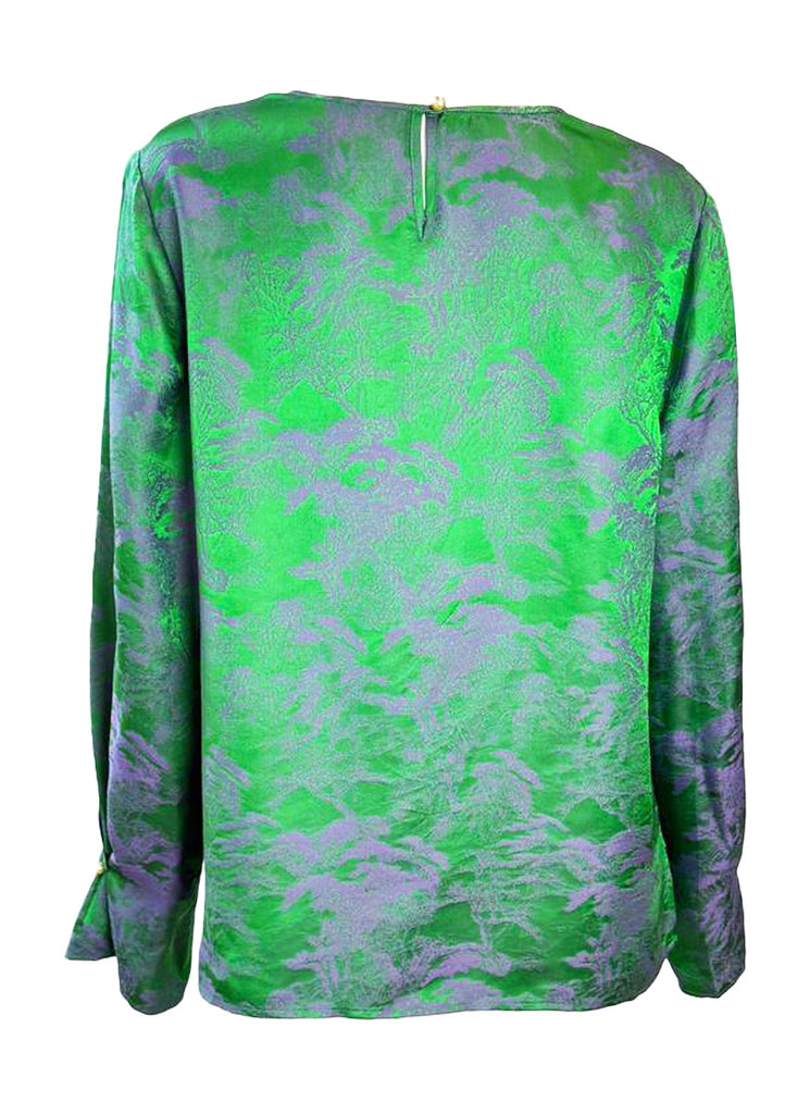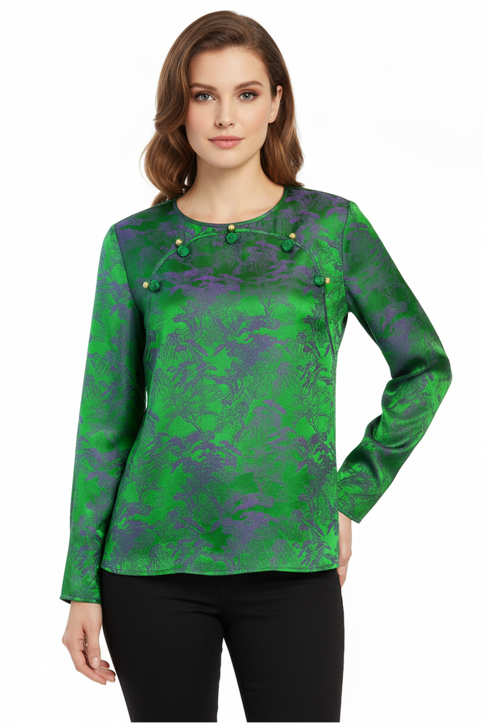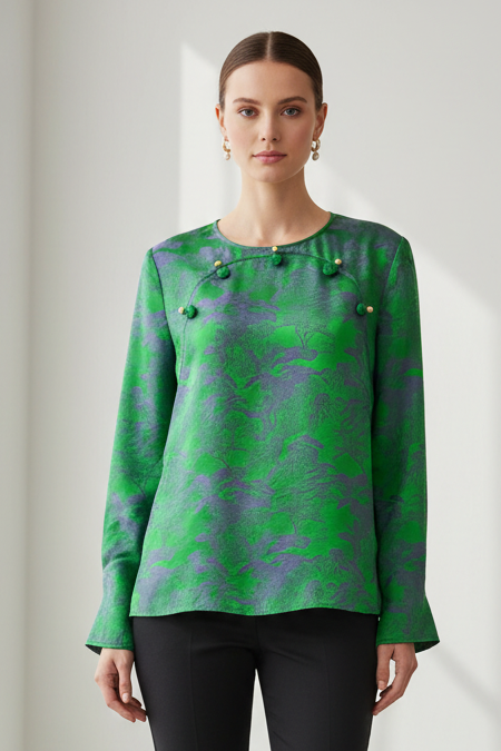- Color/Print: Bright emerald-green silk fabric with blue undertones; a rich, iridescent sheen.