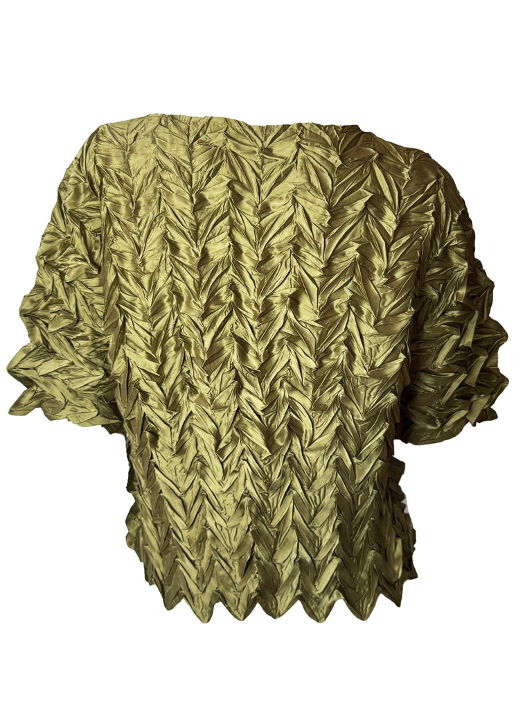 - Fabric/textures: Ruched leaf-like pattern creating a 3D, textured surface.