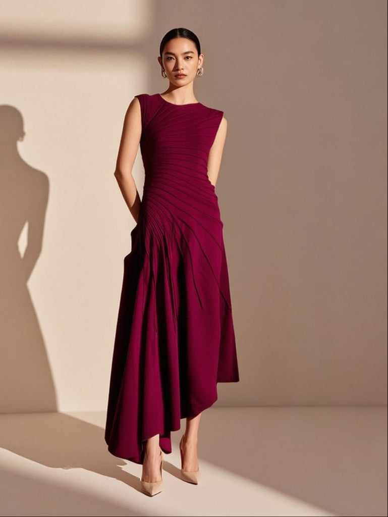 - Style: Sleeveless sheath with a fitted bodice, gathered drapes asymmetric A-line skirt