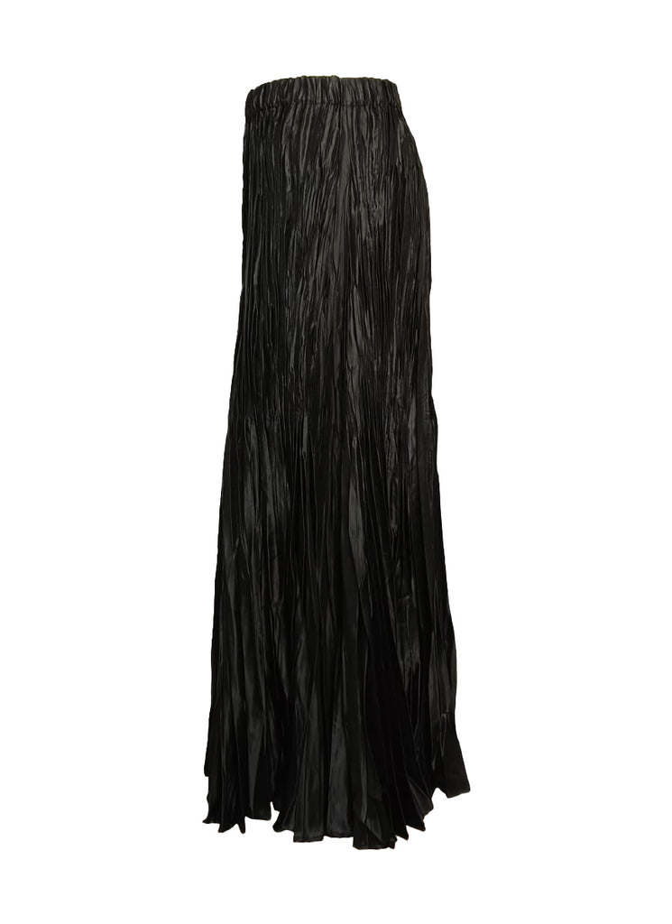 The skirt is a long, flowing maxi with fine vertical pleats throughout, giving it a soft, textured look and lots of movement. The elastic waistband sits smoothly at the waist, and the fabric is lightweight draping elegantly as it flares toward the hem. Elegant & comfortable, suitable for both casual and dressier outfits.