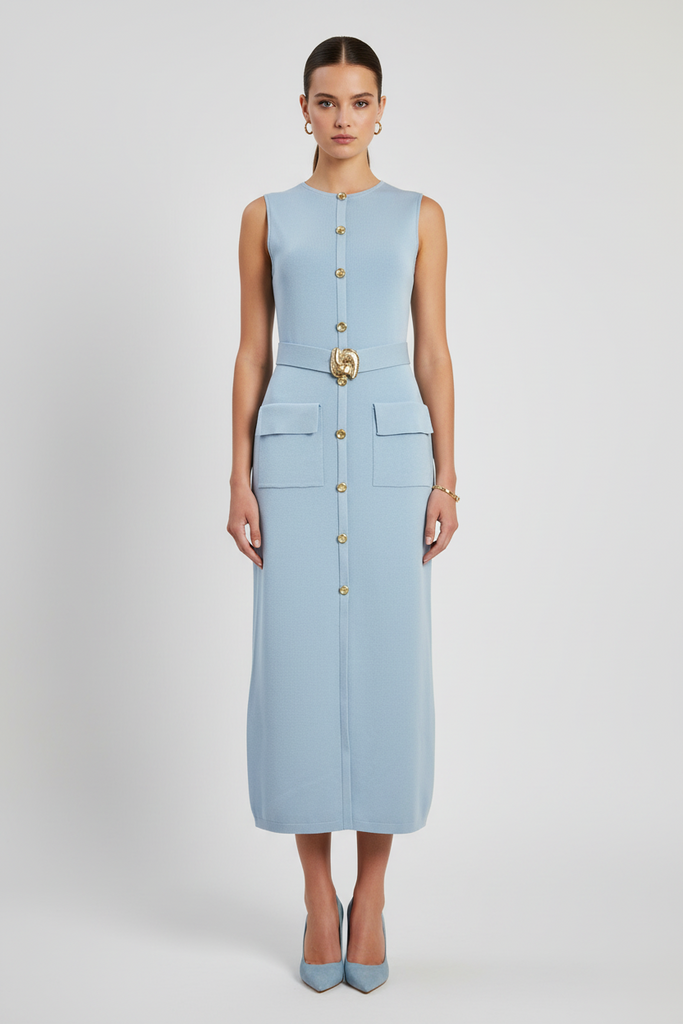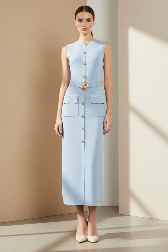 - Accessories: A matching belt or prominent gold buckle at the waist complements the buttons.