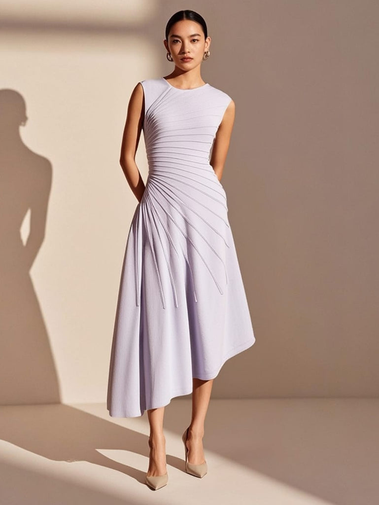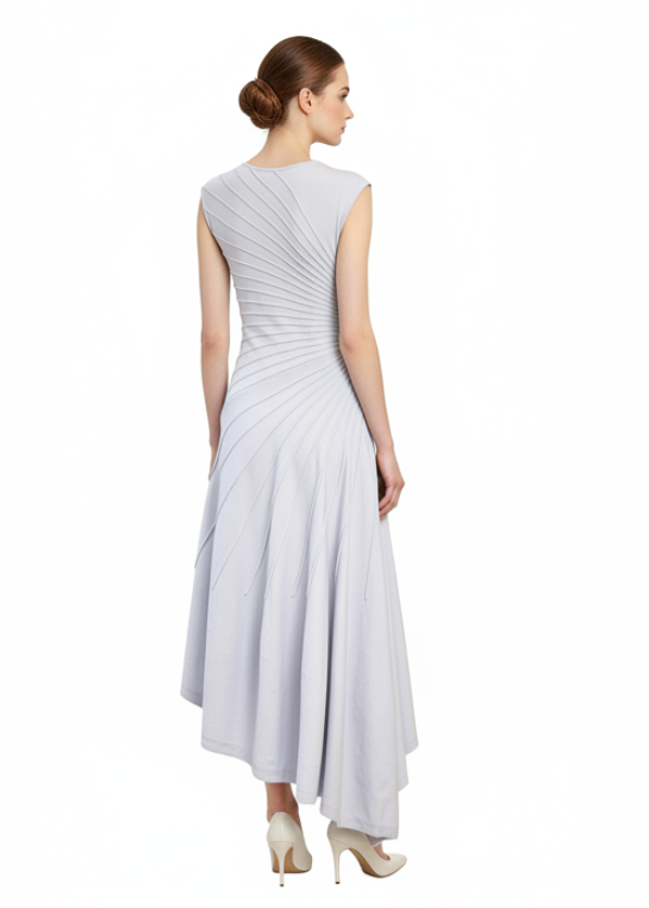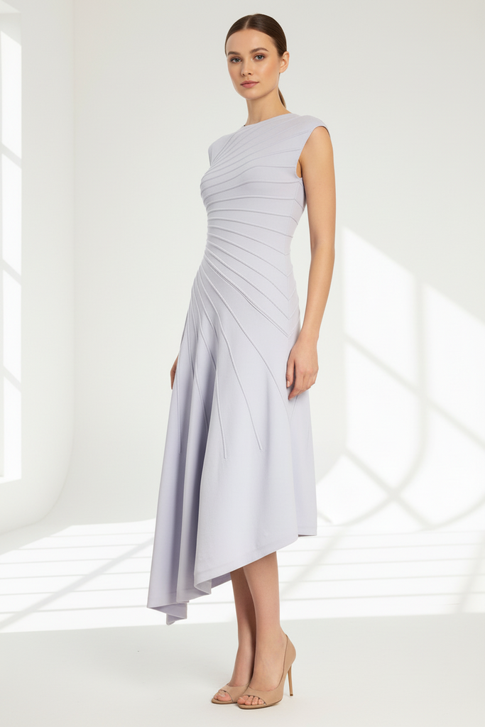 - Style: Sleeveless sheath with a fitted bodice, gathered drapes asymmetric A-line skirt