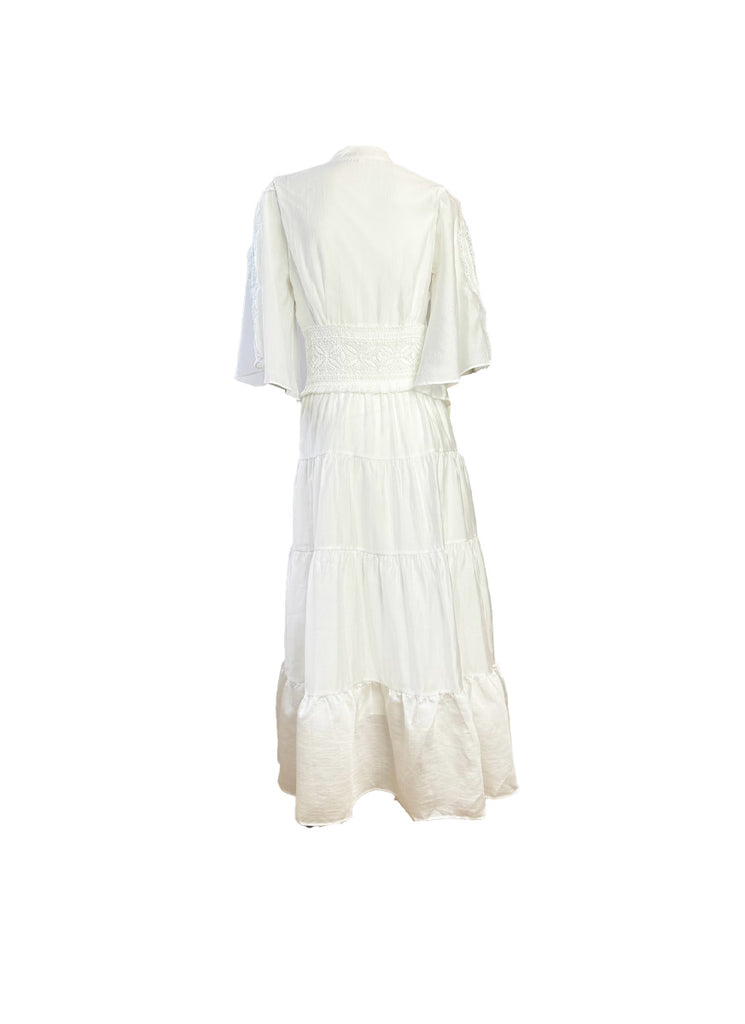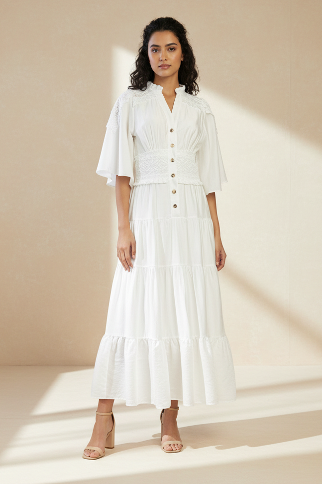 - Style: Midi-length shirt dress with a fitted bodice and a full, tiered skirt