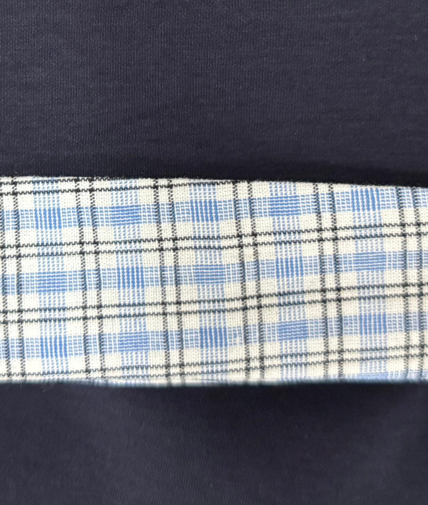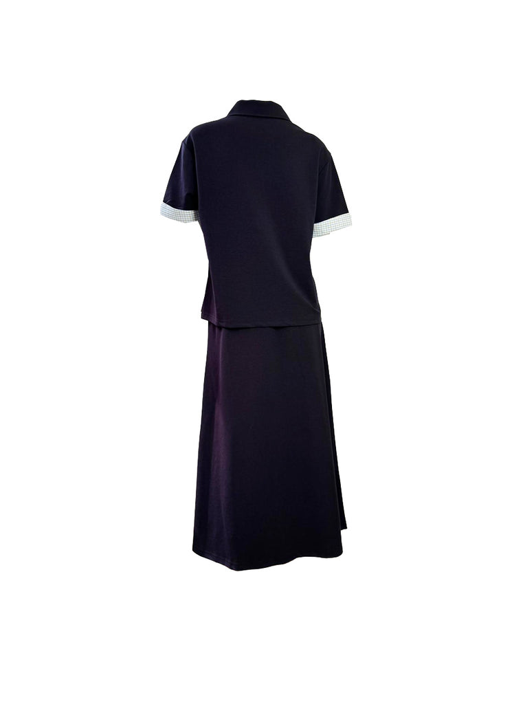 - Top: Short-sleeve polo-style top with a structured collar; sleeves have light contrasting cuffs