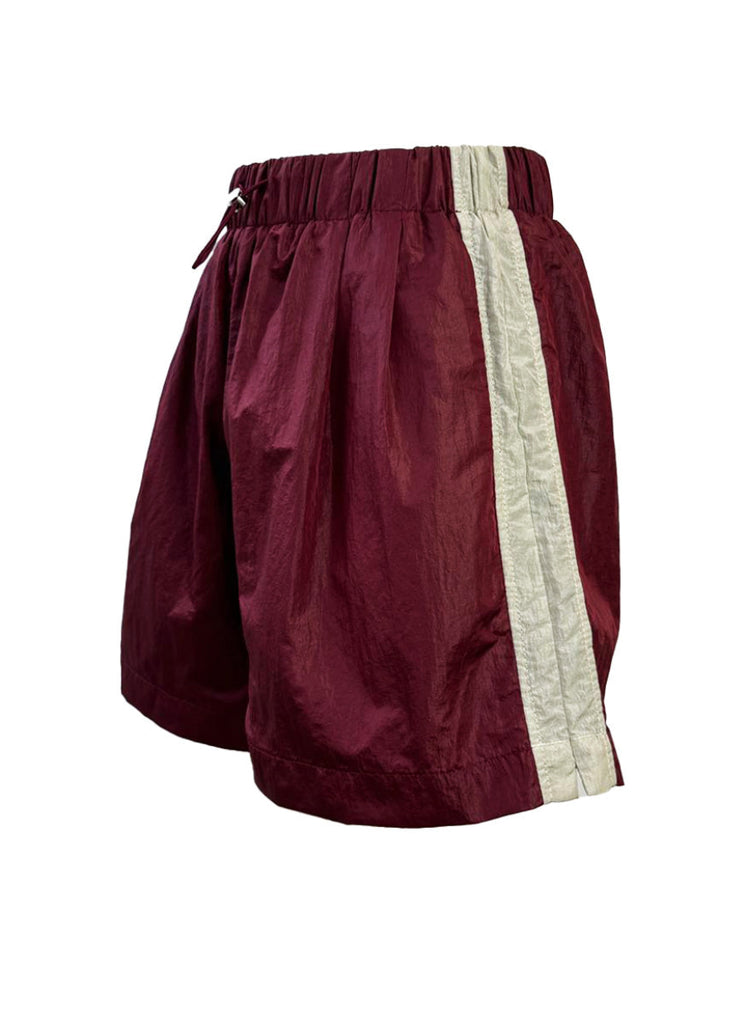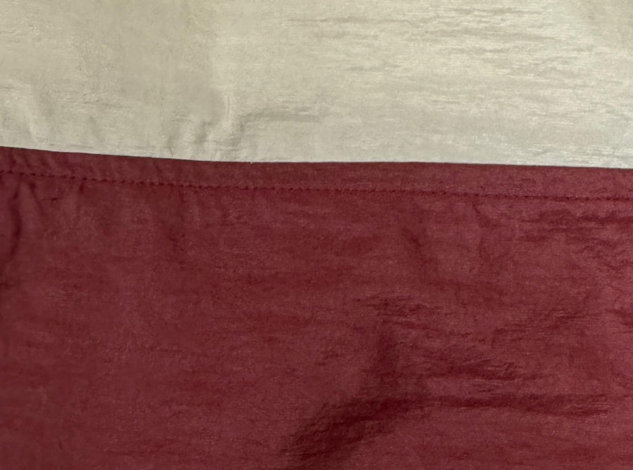 - Jacket: Burgundy track jacket with white stripes down the sleeves, zip front