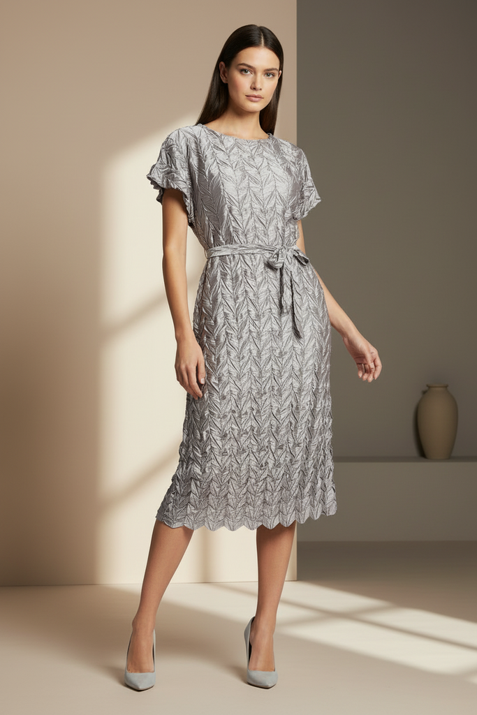 The dress is a knee- to midi-length style in a metallic olive-green shade. It features short puff sleeves and a fitted bodice with a defined waist. The skirt has a full, A-line silhouette with a textured, floral or lace-like pattern that creates a rich, dimensional surface. The overall look is dressy and feminine, with a vintage-inspired charm.