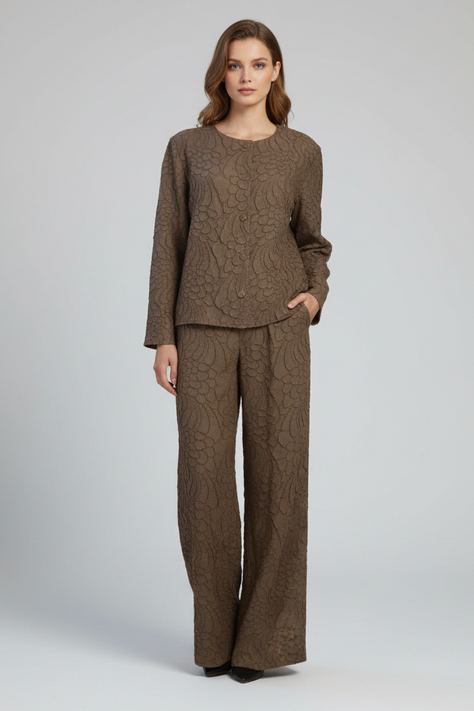 A coordinated two-piece suit in a reptile-textured fabric with a subtle sheen, giving a sophisticated, couture vibe.