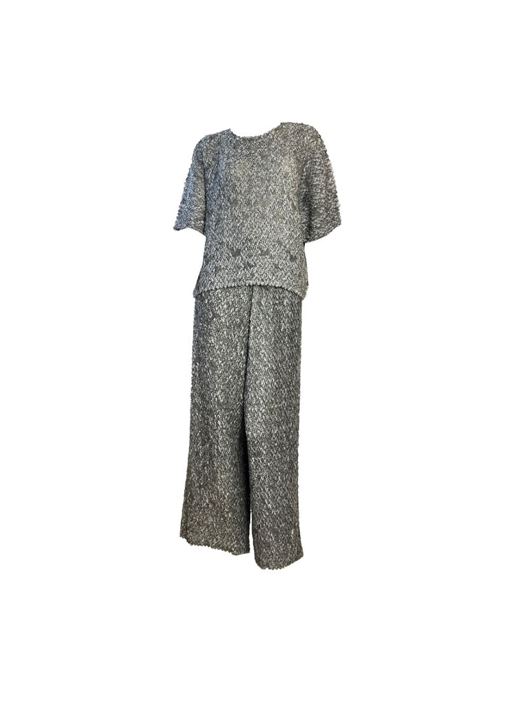 A coordinated two-piece pants set in silver black reflective flecks texture. The ensemble exudes a futuristic, glam vibe suitable for evening events.